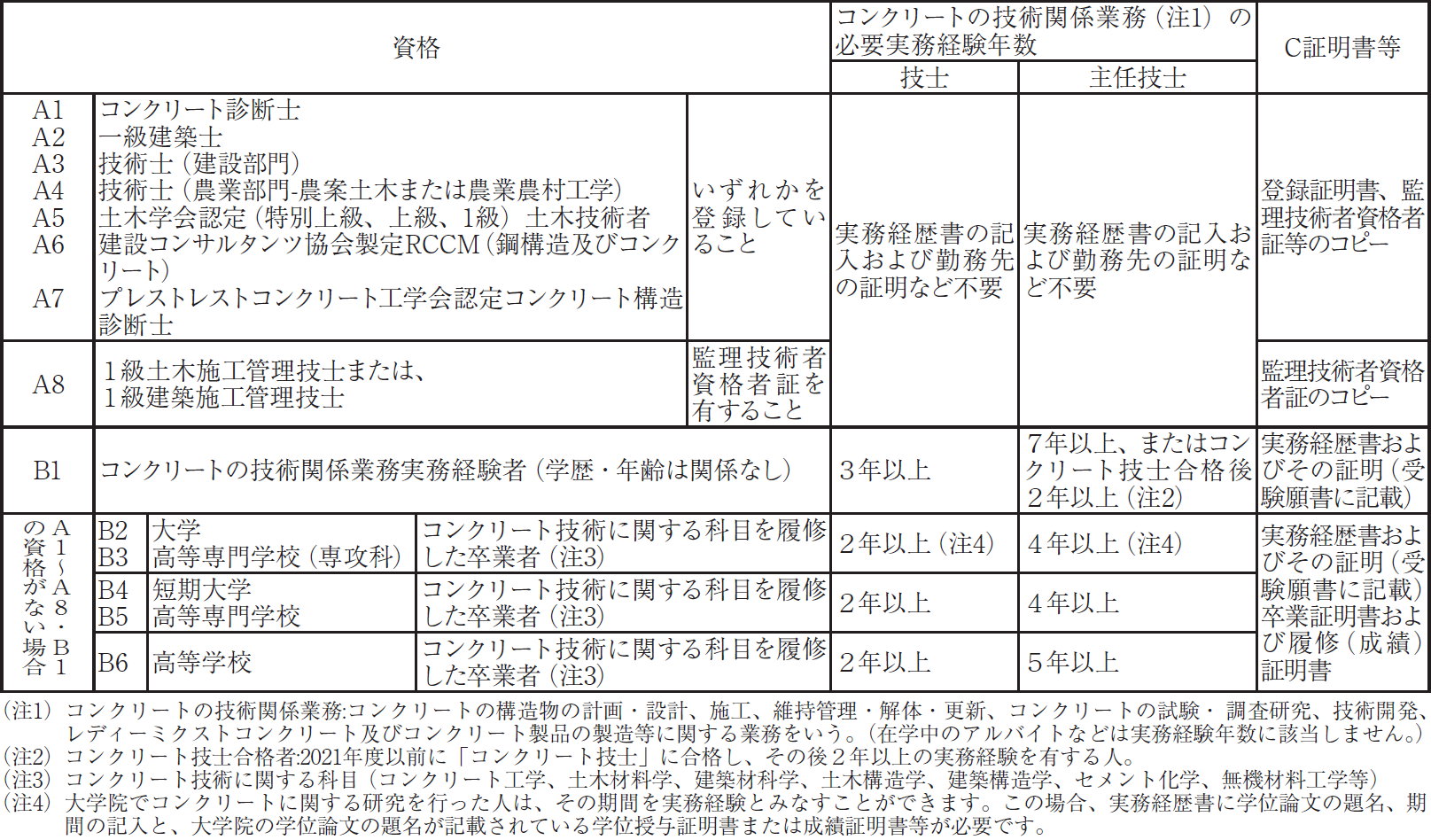 また、コンクリート技士およびコンクリート主任技士の資格は、コンクリート診断士試験の受験資格要件の一つとなっています。